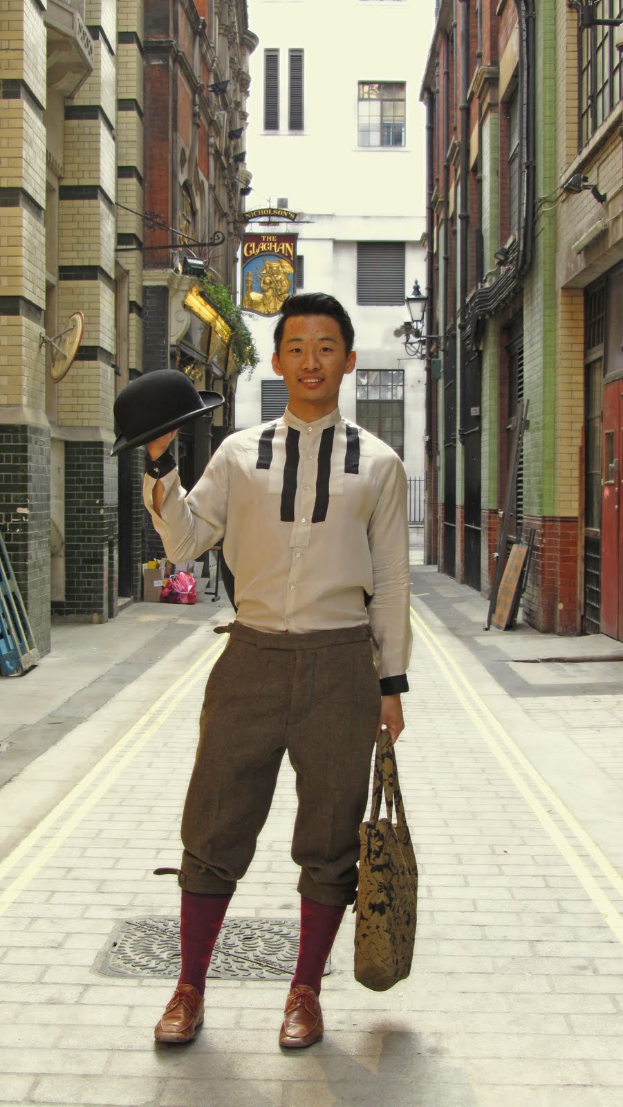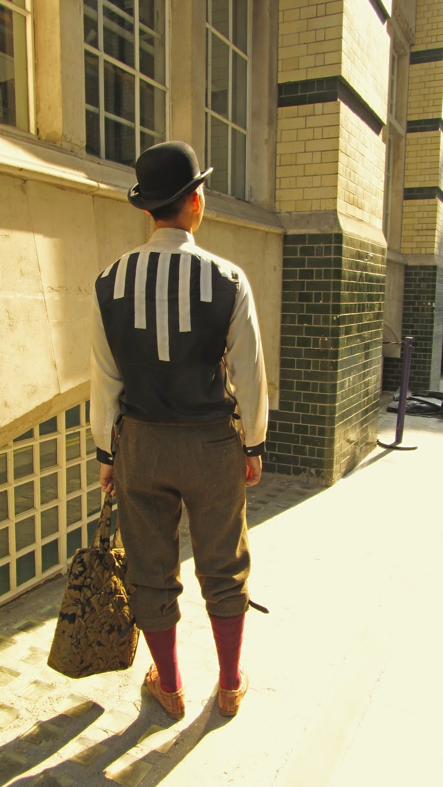 The back of the shirt showing an inverse of the front. The bowler hat is a vintage that I bought from a charity shop ages ago and managed to restore it to a wearable state. The 3/4 tweed trousers was something I picked up a while back too. Hopefully I have managed to convey a Britishness look (in my own special way) to celebrate this happy day.