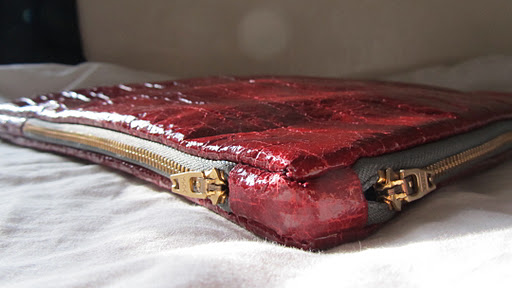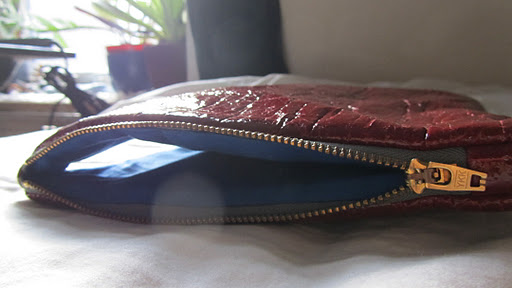 For the portfolio case, I used a fake leather fabric but close up look like distressed PVC and also used the leftover fabric from my blue shirt to make the lining. I decided to put two zips on the top and side of the case just for the fun of it and it made it look different.