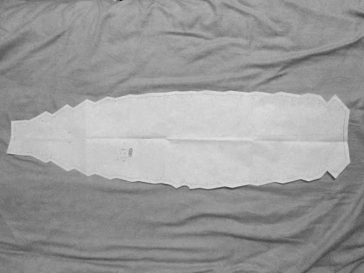 The pattern started off with the pleats on the raglan sleeve as this was the main feature. There is no seam connecting the front part of the sleeve and the back as this has been taken in by the pleats. I had to cut the pattern off at the elbow as the raglan sleeve was already more than a metre long. The middle line of this pattern is what was the seam from the front and back pieces.