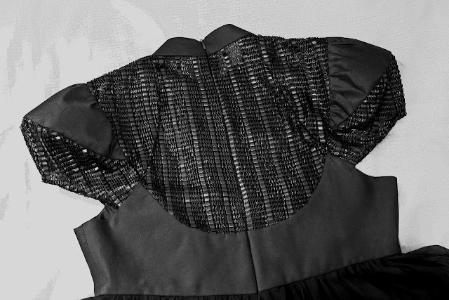 I used several type of materials for this dress but most of it were remnants. The base is a cotton sateen themed with a kind of modern lace I found in the remnant box. The lace thing caught my eye as it looked like a modern lace. From the picture, it looks like sequins but it’s actually pleats of a ribbon like material and loops of strings. The bottom of the dress is just normal silk chiffon backed with the cotton sateen. I’ve left the hem raw, first to cut off any additional length when I am fitting it to my sister and second to leave it floaty and light.