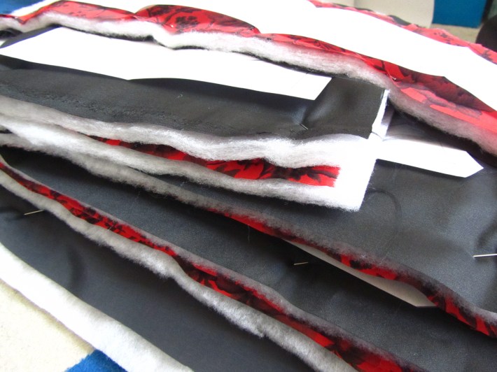 To make the quilting process a bit easier, the pieces were roughly cut up to correspond to the size of the pattern pieces. This made the sandwiched layers small enough to be quilted on the domestic sewing machine. The fabric, wadding and lining are all then placed together and roughly pinned to fix all the layers.