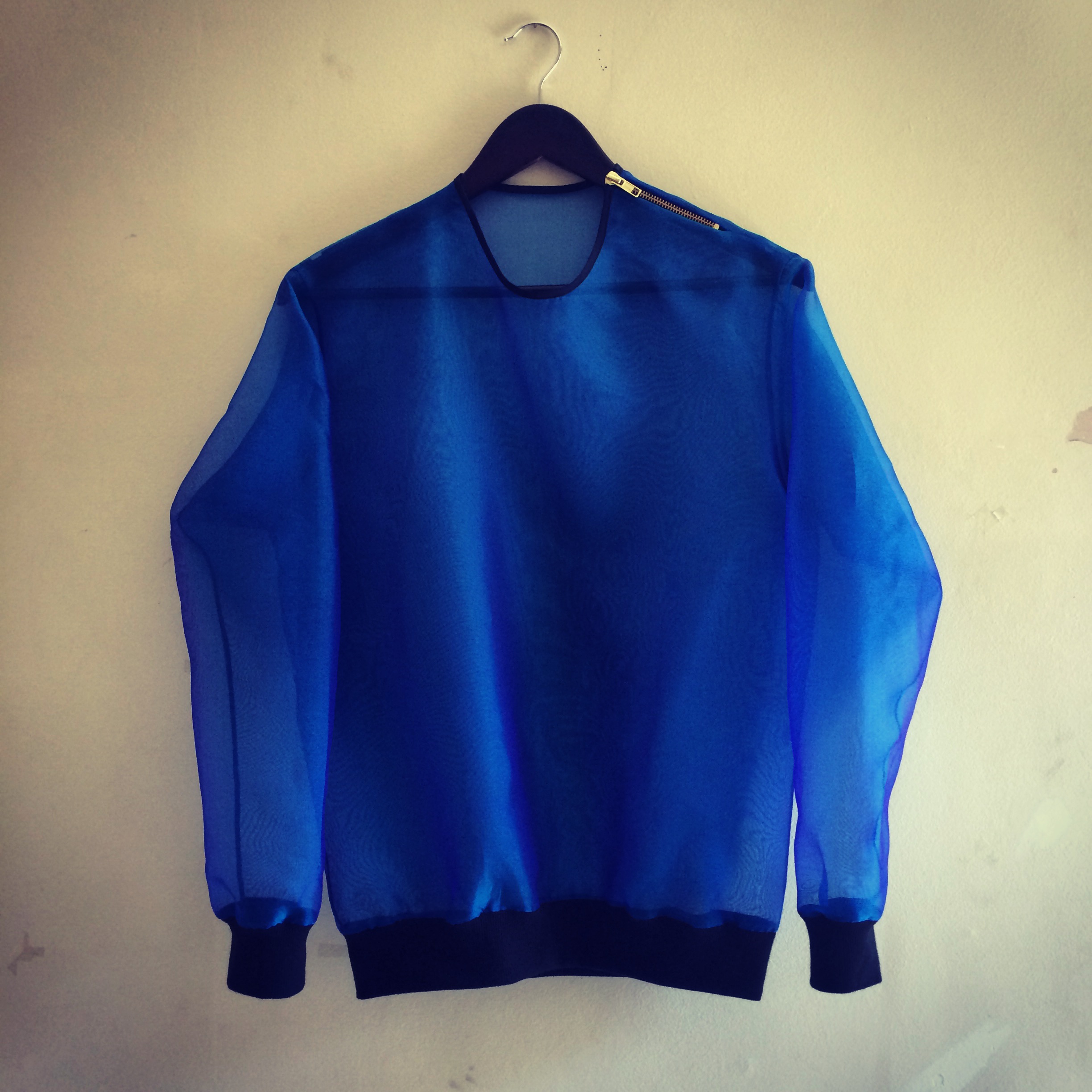I’m willing to experiment and even if it fails, at least I know it doesn’t work or there may be grounds for improvement. So I went out yesterday and bought this blue/violet shot silk organza and after wrestling with my overlocker (I ended up spending a couple of hours fixing it), I made a sheer organza sweater.