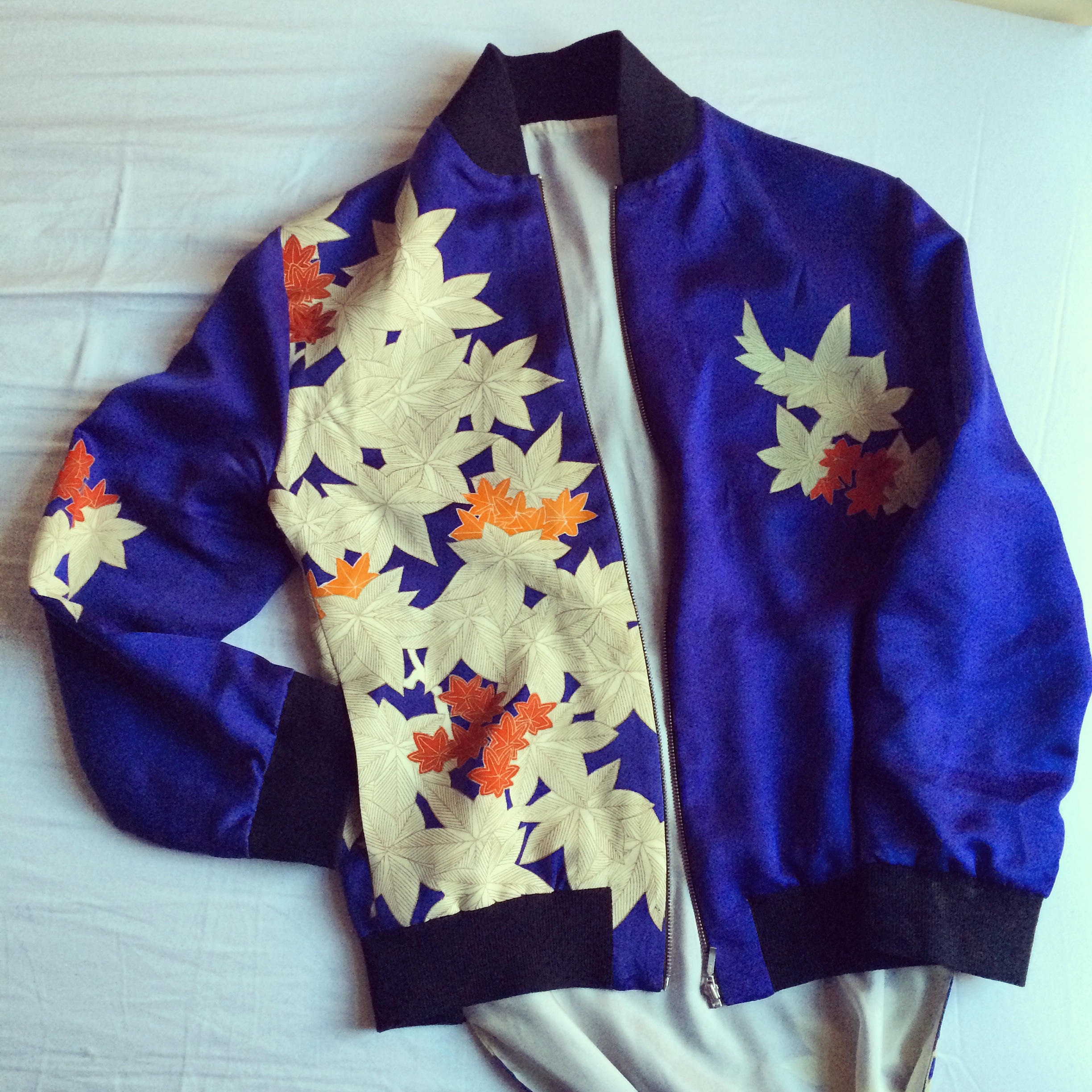 One of the idea was to make a bomber jacket using the Kimono fabric but with long train (so it looks like a Kimono from the back). So armed with a modified bomber jacket pattern, I spent the next few days trying to formulate a plan on how this garment should be stitched together. The plan went well and the end product was quite awesome.