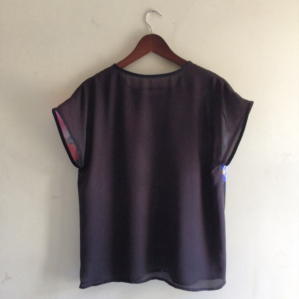 The fabric sat there for a week as I was thinking how best to make something that preserved the print while making something comfortable for my sis to wear. Then as I was browsing for fabric along Berwick Street, I managed to get my hands on this gorgeous black silk georgette chiffon (at a knocked down price of course) and decided to make a simple blouse with the print in the front and the chiffon at the back.