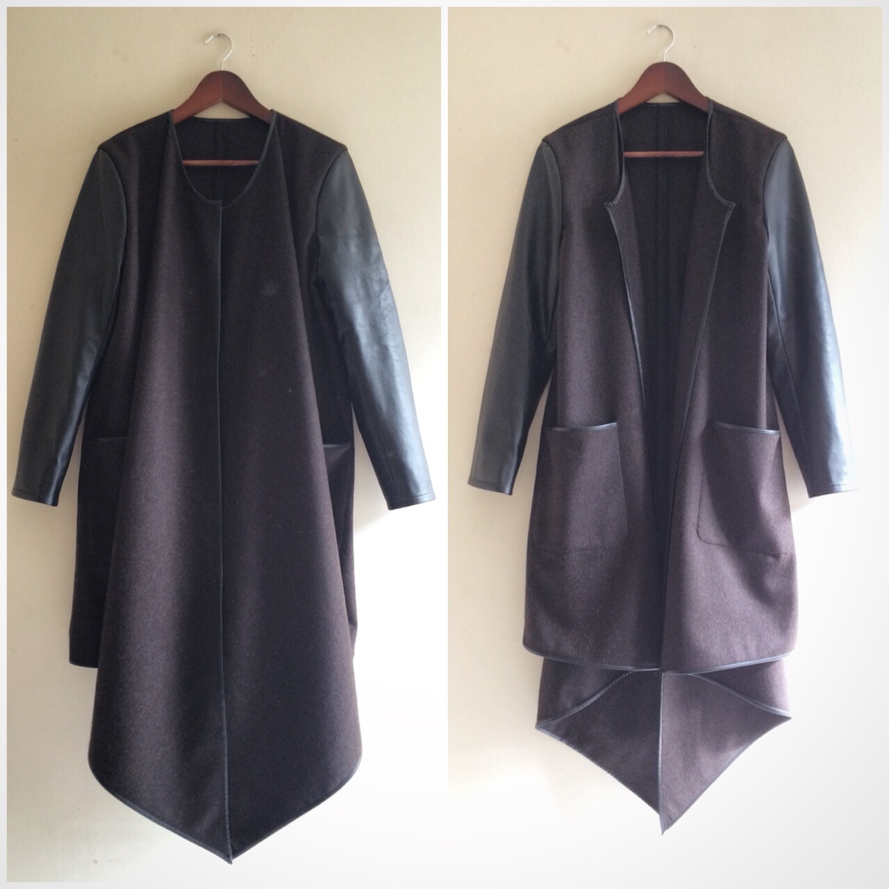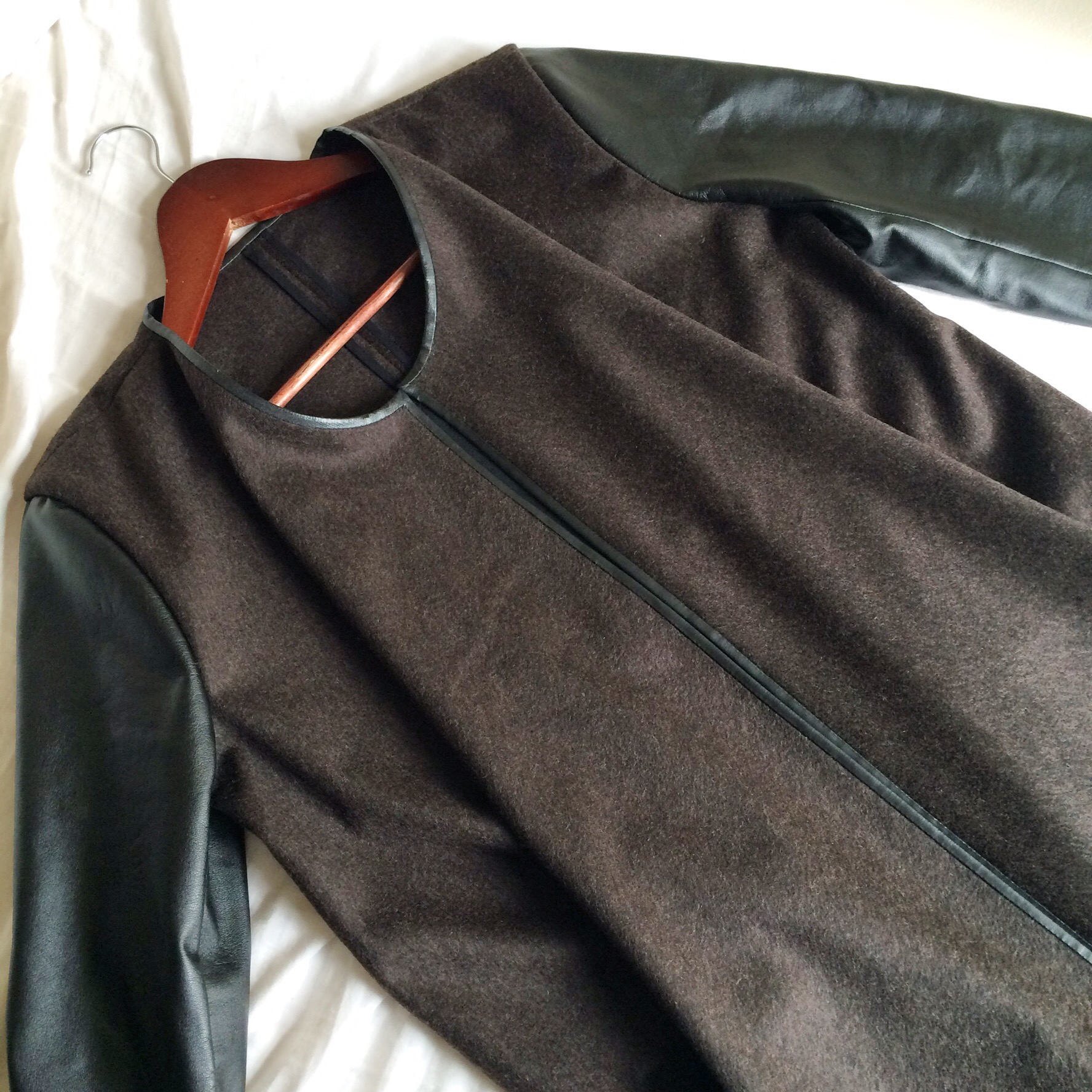 With the pattern all drawn, I preceded in cutting the fabric (luckily the moths has not got to it yet). By this time, I had already decided on the corresponding pieces and finishing, namely faux leather sleeves and faux leather binding around the edges. The task of sewing was actually pretty straight forward and easy.