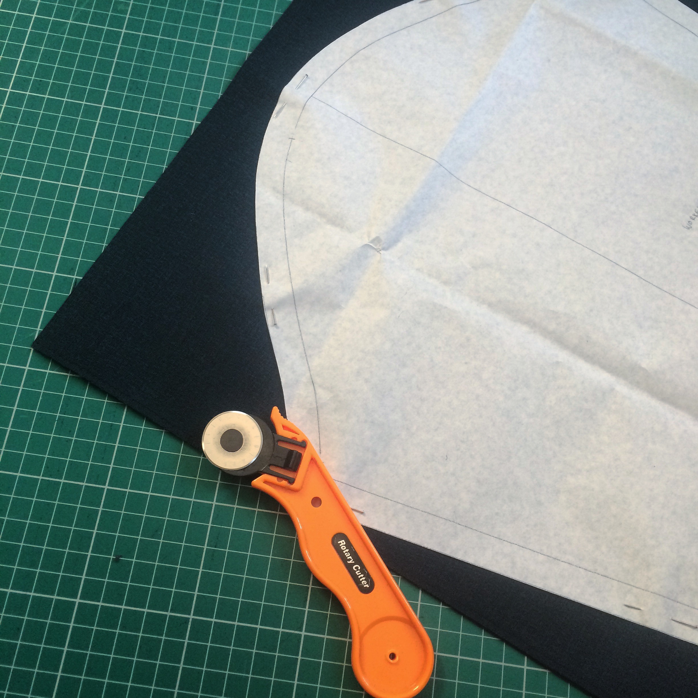 With the fabric decided, I proceeded in drawing up a pattern for the jacket and made allowances to ensure that the pattern will fit the 39cm wide kimono fabric. I also made the fitting loose (so I could wear layers underneath) and ensured all the references of the work jacket was there; i.e. collar, cuffs, pockets, etc. Once done, I proceeded to cut the pattern, with my preferred choice of cutting apparatus – a rotary blade! The blade makes cutting more accurate, speedy and reduces fraying. Just be careful where you put your fingers!