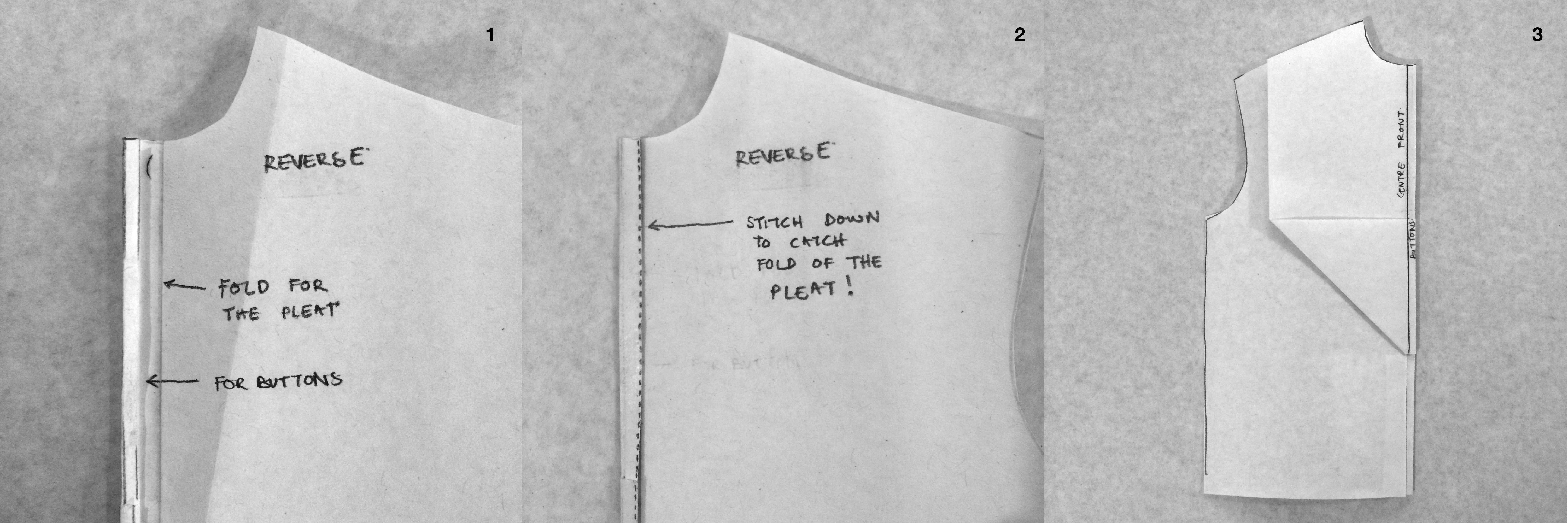 Hopefully my thought process is not to chaotic and it shows you a method that I use when coming up with a pattern. An element with a pleat folded over can create something interesting and from this point, I could apply the same principles on the sleeve or yoke. I could make the pleat bigger or could add in more than one pleat and repeat the same process above.