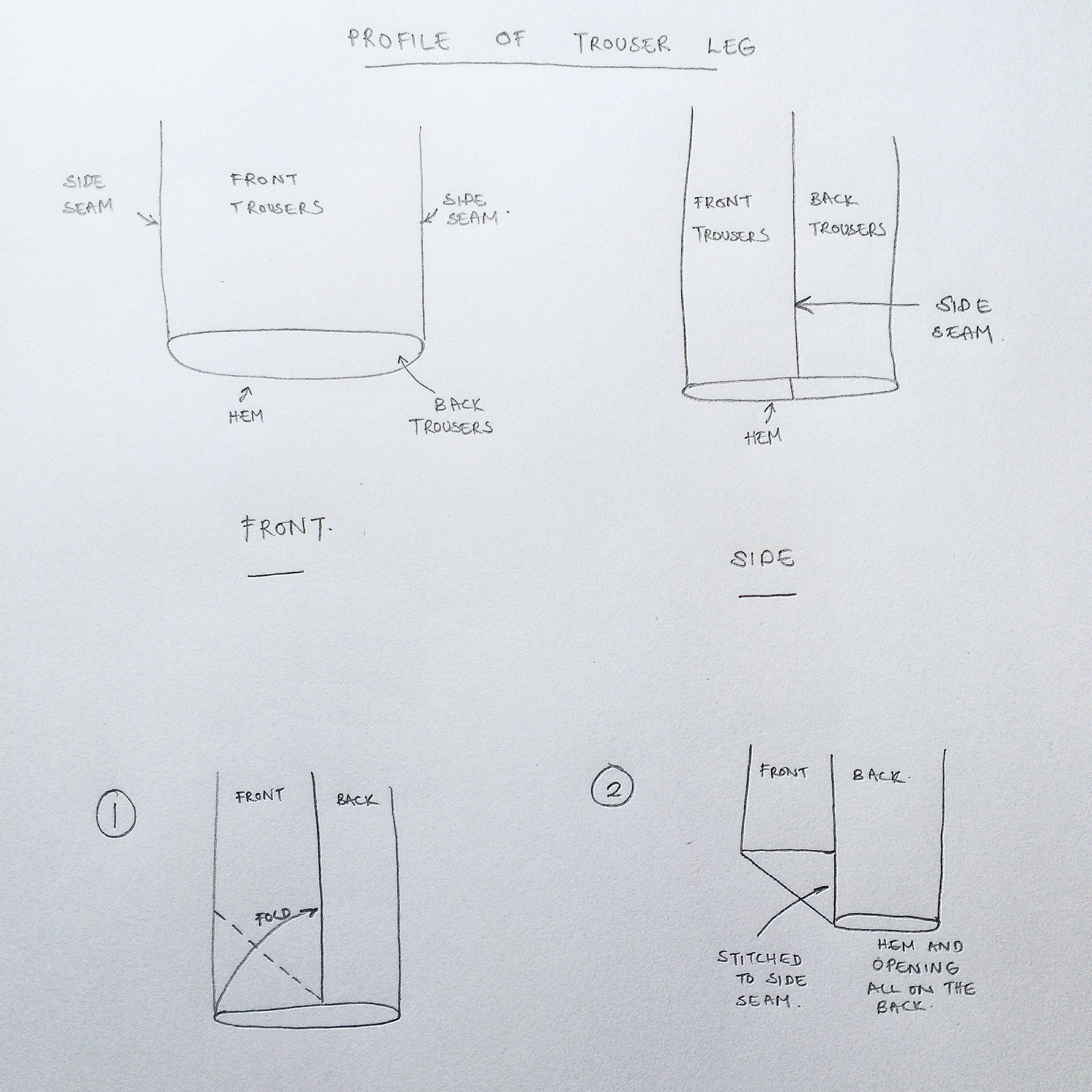 It all started when I was wearing my wide leg cropped trousers. As I was sitting down, the front part of the hem folded and sat neatly on the side seam. This sheer coincidence became my basis for the details of this trousers. I’ve done a quick sketch to explain how it works.