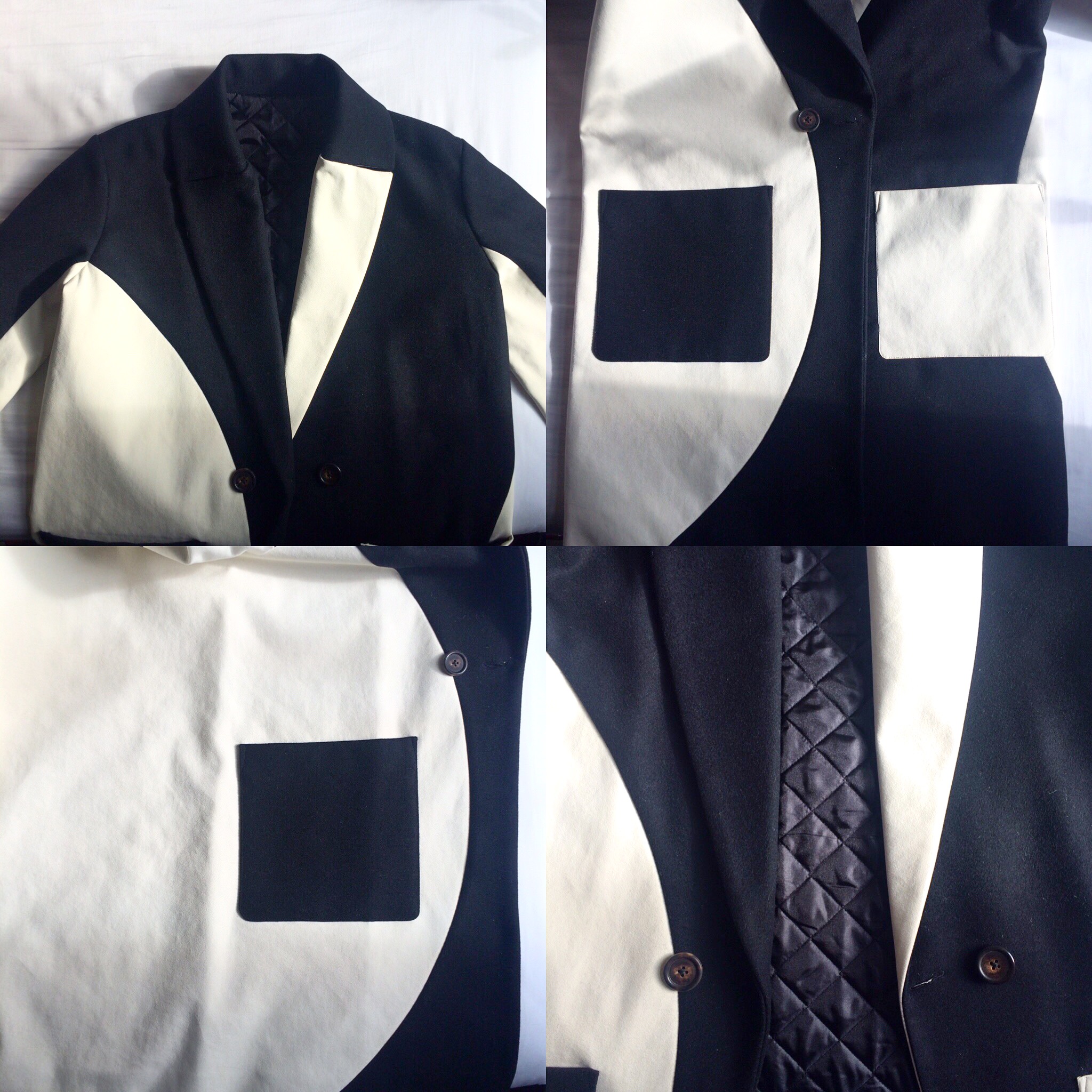 I noticed how the triangles could be the lapels and how the rectangles could be the pockets. This concept immediately stuck to my mind and I began to trawl though my fabrics to see what I could use. To my surprise, I found a length of black wool fabric and some white Alcantara (a man-made suede) which fits in well with the colour scheme above. The soft texture of the wool and the smooth feel of the Alcantara would also lend some luxury to the design.