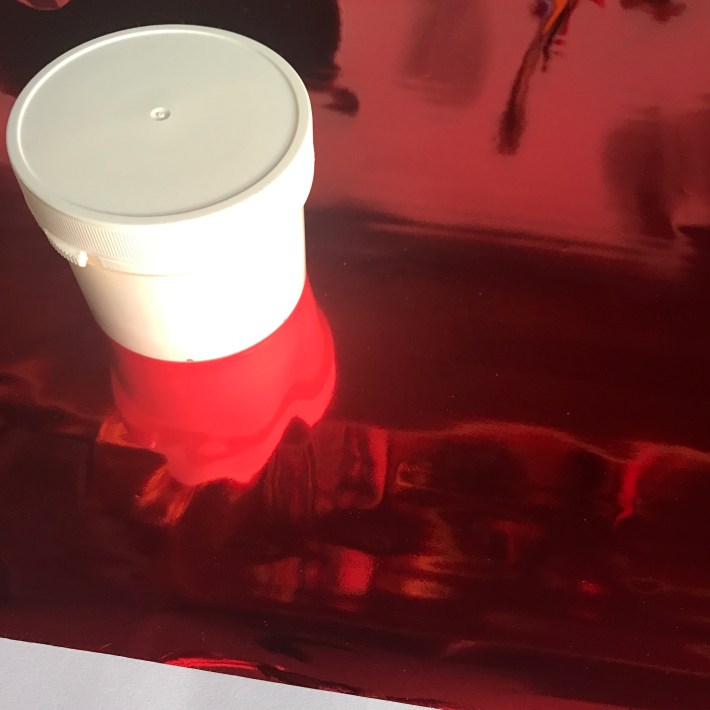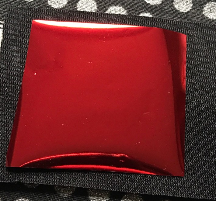 STEP 3: Place the foil on top of the dry adhesive with the right side (red side) facing up. The back of the foil (silver side) should be touching the dried adhesive.