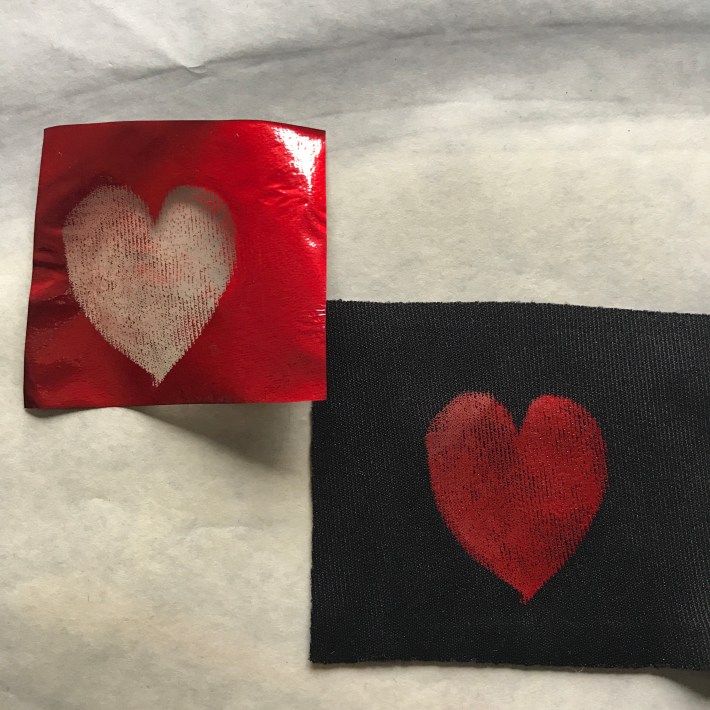 Printing on fabric has always been an interest of mine, as you can create amazing surface patterns using various techniques. However, I’d always assumed you needed specialist equipment and a special area to create all these amazing prints but was told that some techniques can be easily replicated at home. One of the techniques I had always wanted to try was foil transfer printing. This opportunity arose when I made a sweater and shorts combo with a material called ‘Scuba Jersey’, but found the black a bit too plain. I initially wanted to embroider a heart shape on the sweater but was hesitant due to the time it may have taken.