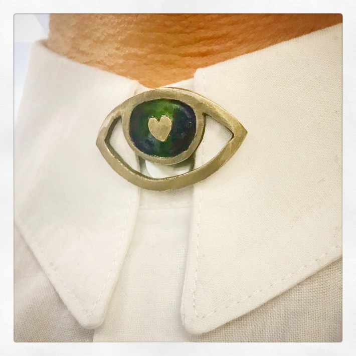 When I was ready to make the real thing, I decided to make a pendant. I decided to start easy and made an eye with blue/green glass enamelling. My first pendant was crude but was nevertheless successful.