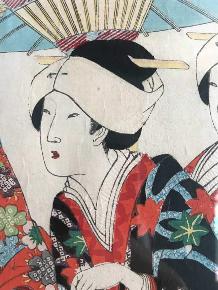 That’s when the idea struck. I would like to have a pair of shoes with Japanese prints. One of a Kabuki actor and the other of a Geisha. I knew which picture I wanted to use for one side of the shoe but when I dithered about the other side, I realised that the answer was on the wall. Well, when I say wall, I mean the Japanese woodblock print that I have hanging on the wall. The print I had is a very old print (around 1850?) of a Geisha with her attendants.