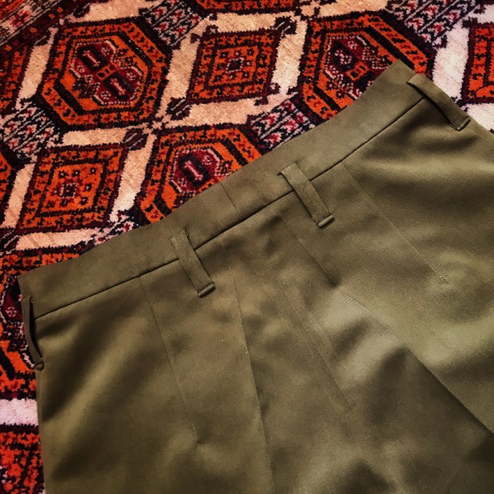 I was tempted to make another pair but rummaging around the supplies box yielded nothing, so on a trip to London, I went to the clearance section of the fabric shop to see if I could find the type of fabric I wanted. I managed to get a remnant heavy weight fabric in army green and replicated these shorts. However, I changed the direction of the pleats because I was wary of how the shorts bulged out in the front.