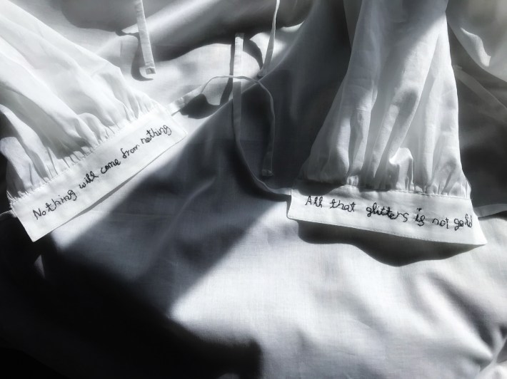 The actual shirt from the museum was skilfully embroidered with motifs of flowers and hearts. I realised that if I left mine plain it would be quite boring, so I decided to entertain the thought of embroidery. But after looking through my book on needlework (another book that has been gathering dust), I decided that swirly lines and flowers were too complicated. Instead, I reimagined embroideries of text instead of flowers. I immediately thought of quotations from William Shakespeare and settled for three, one around the neckband and two around the cuffs.