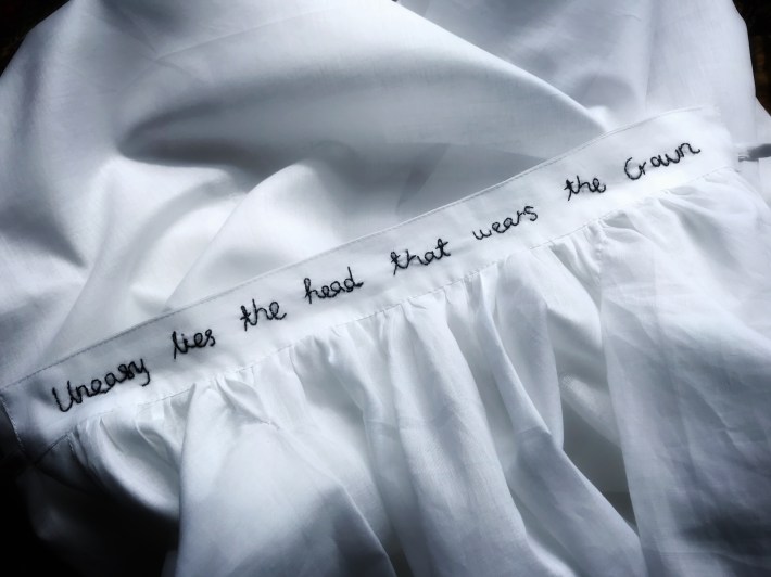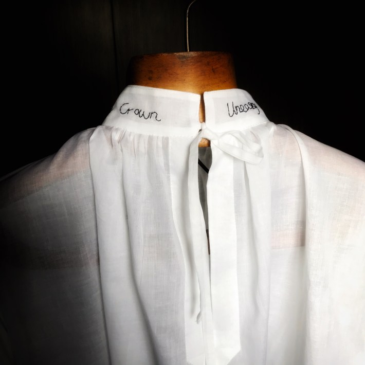 With regards to the three quotations that I settled for, the first was ‘Uneasy lies the head that wears the crown’ from King Henry the Fourth. This is placed on the neckband because anatomically, the text is directly below the head but was also done to give myself a bit of confidence. No doubt some people will be laughing at me for wearing this shirt but I’m not doing this for them.