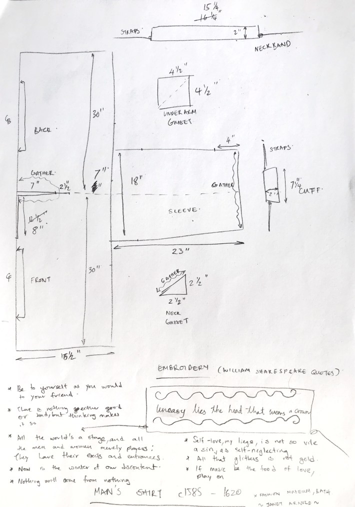 Anyway, I somehow felt that this voluptuous but simple shirt evoked the romanticism and allure of the court of Queen Elizabeth I or maybe it was the work of William Shakespeare with Romeo and Juliet. Anyway, I was hooked and decided that this was similar to what I wanted (I’ll figure out how to wear it later) and fastidiously studied the patterns, made some rough drafts, measurements and produced an outline of how the pattern would be drawn.
