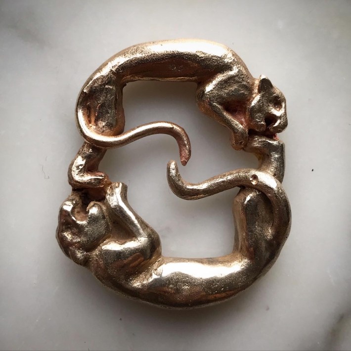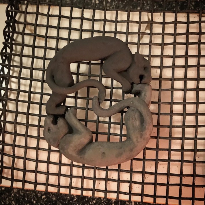 The form is very rudimentary but it was a good start. With the clay dried, I used it to make a mould so I could reproduce the form in metal clay. Instead of one Jaguar, I decided on a twin and used white and gold bronzes.