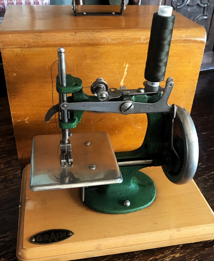 While browsing around, I spotted a tiny ‘Grain’ sewing machine. It was so small that the box it was housed in could rest on my hands. I recently saw something similar on TV and thought it was a coincidence to see a specimen in real life. I had always wanted a small hand operated sewing machine for sewing leather, as I could control every single stitch, so I asked the seller for more information about it.