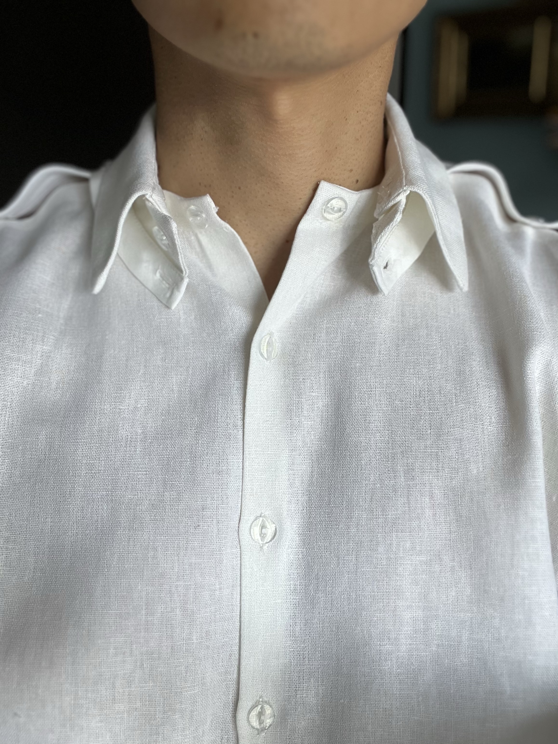As for the fabric, I used linen because of its green credentials. It also made the garment comfortable to wear for summer. The sleeve was also adaptable to the changing weather by the removal of the longer part of the sleeve to create short sleeves. This applies to the collar as well and I can take off the top collar to create a mandarin collar or a collarless shirt.