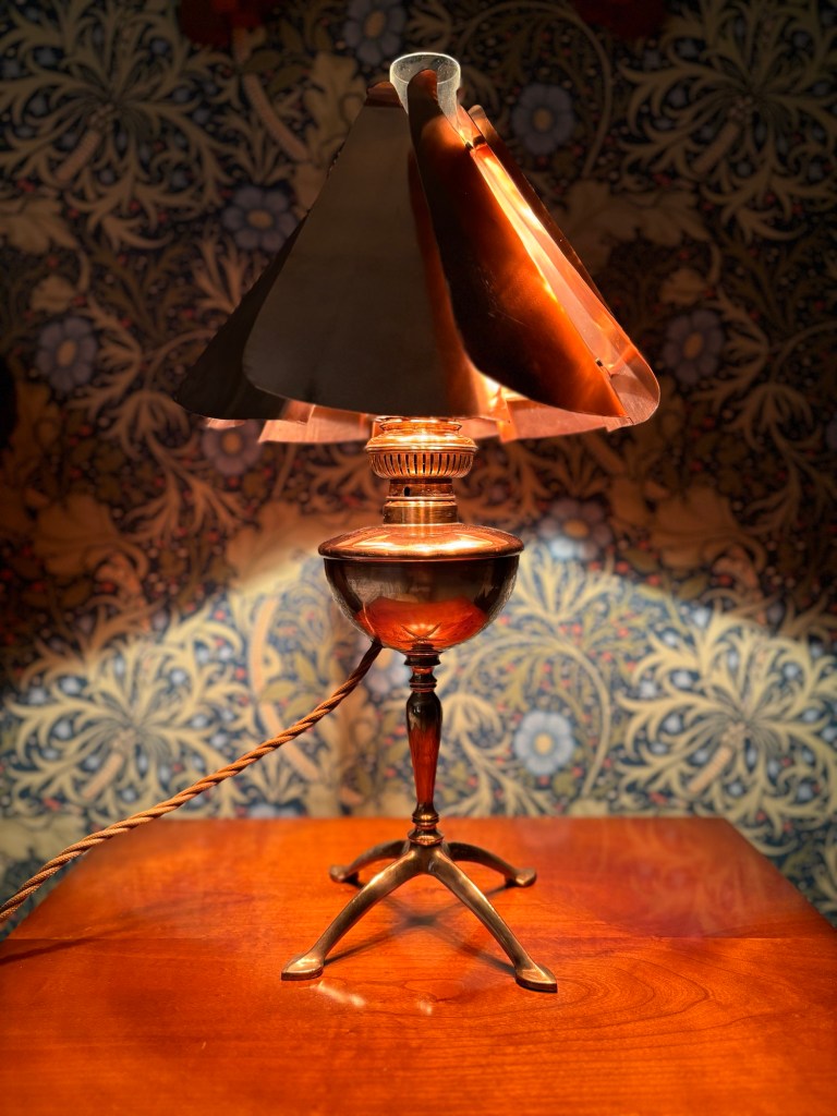 On one occasion, I managed to bag an antique lamp by a famous maker, and then mismatched an antique glass shade with it, as the original was long gone. This was given to my partner as a Christmas present and became a feature in our home for many years. That was until recently, when an accident meant that the glass lamp shade smashed into so many pieces that I was still picking up shards weeks after the accident. Luckily as the base was made of copper and brass, it survived the accident but stayed ‘naked’ for a while.