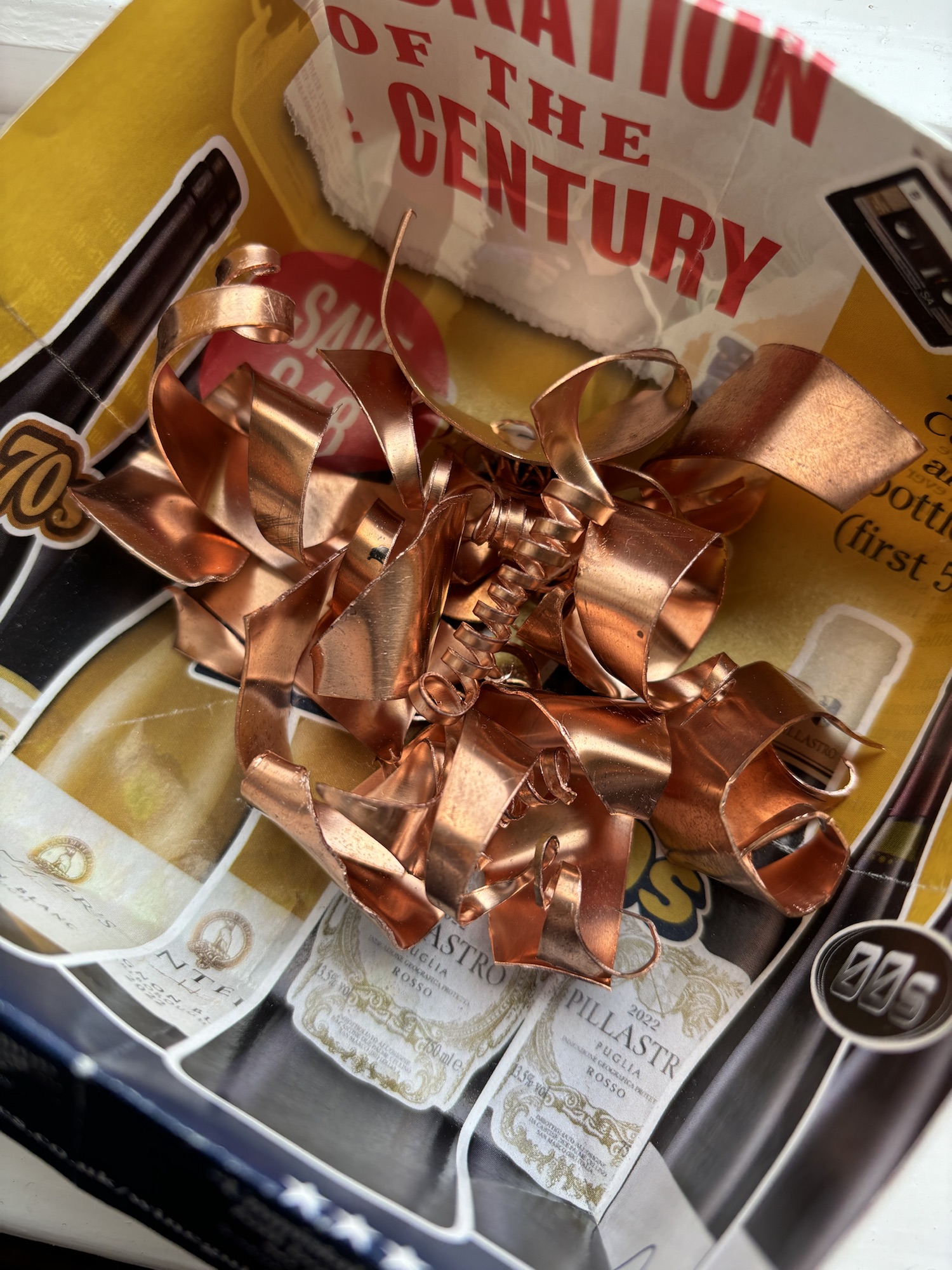The only problem I had now was the scraps from my project. I felt that it was a shame to throw these curled copper offcuts away, but doubted I could recycle such small quantities. I left the scraps in a box stored away in the attic until recently, when a visitor wore some earrings that looks like they were made out of a piece of beaten copper wire in a serpentine shape.
