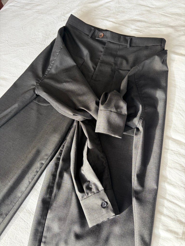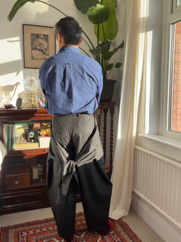 When sewing this piece, it really played with my mind. One minute, I was sewing in the zip for the trousers, and the next, I was attaching the placket. I was also laughing when I completed it as the trouser looked like a jumpsuit for a torso-less person.