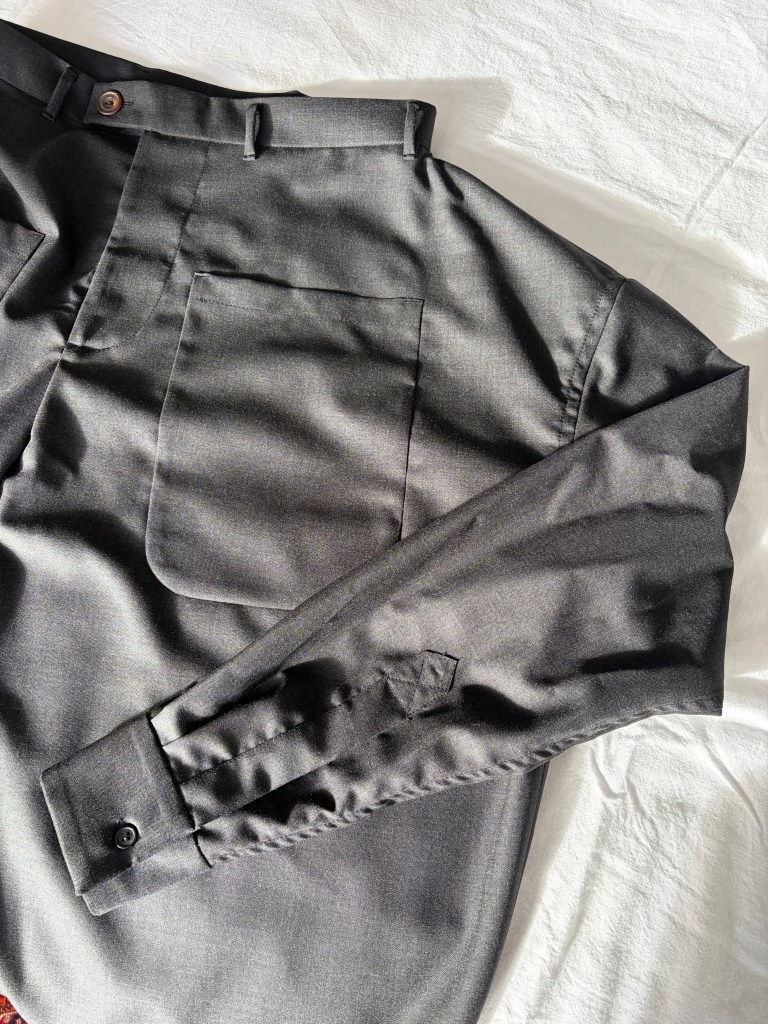 I have also utilised the shirt pocket for the trousers and sewed in a bluff pocket. This was very handy as the position of the sleeve meant that side pockets could not be inserted. Skimping on the details is not something I do, so I went all the way to insert a working sleeve with a placket, cuff and buttonhole.