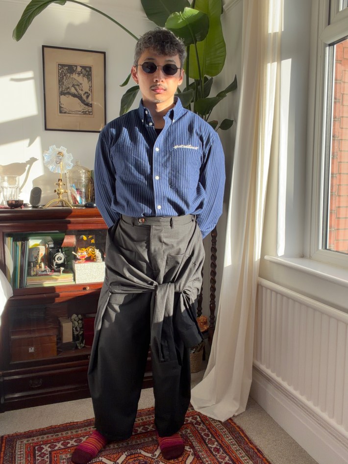 At first read, this question had an obvious answer, but when you think about it, traditional schools would tut if you said a sleeve was anything other than a covering for your arms. But being at Central Saint Martins, the question provoked critical thinking and the possibility that we had been institutionalised to accept that a sleeve cannot be anything else. When I did my research, I discovered from a styling point of view that sleeves of shirts and sweaters have been tied around the neck, popular with a preppy ‘Ivy League’ style of, but at the same time, sleeves had also been tied around the waist as part of the 1990s grunge look. Both very different styles, utilising the same part of a garment and none worn on the arms.