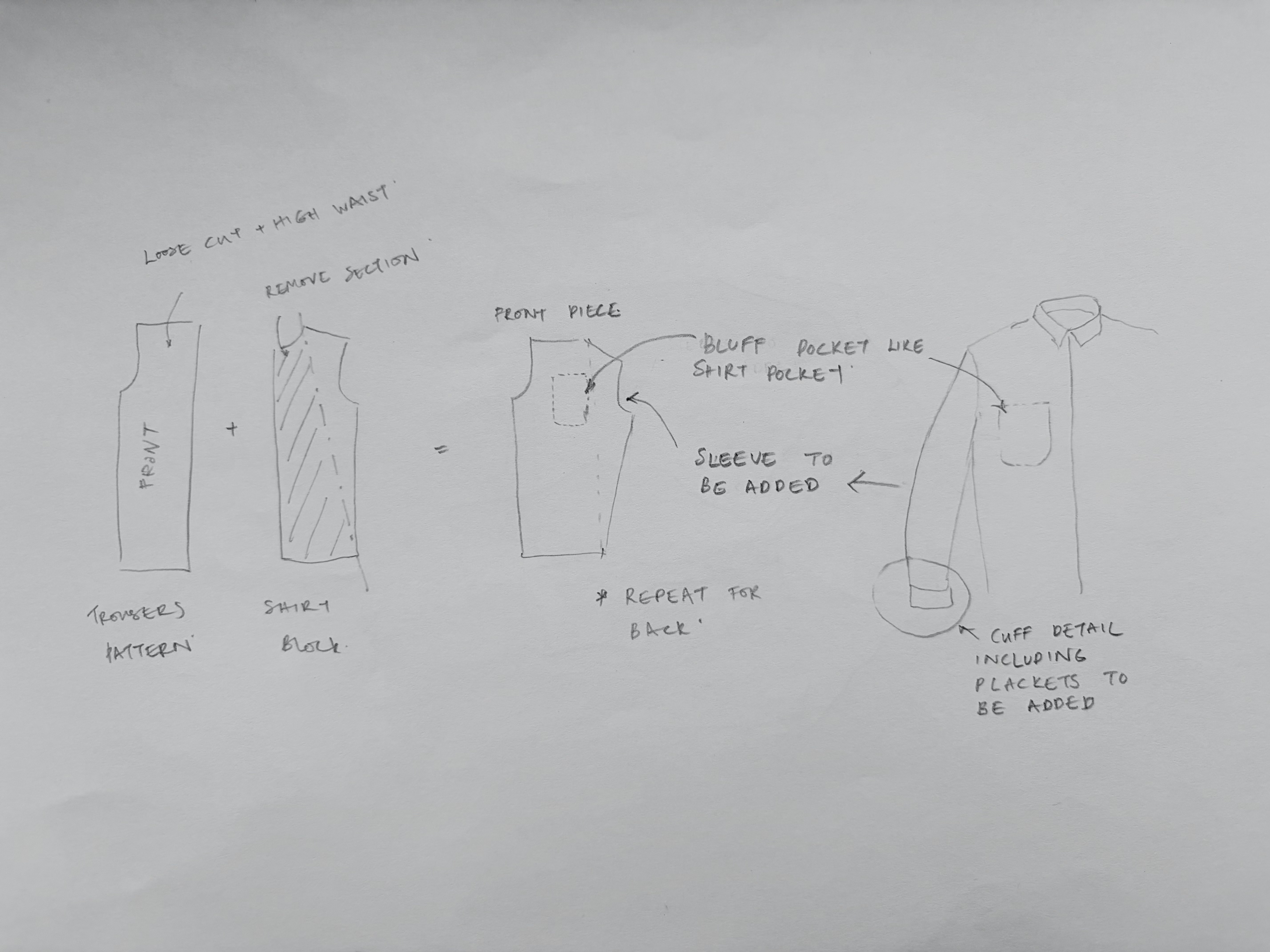 The development of this pattern was actually very straightforward, as it is essentially part of a trouser pattern merged with part of a shirt pattern. It was also made easy due to the fact that I had my reliable trousers and shirt pattern that I developed and changed throughout the years.